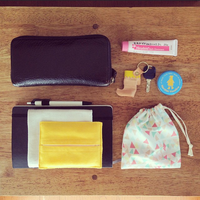 バックにピッタリの巾着、ハンカチ、ティッシュカバーを作ってご機嫌。
